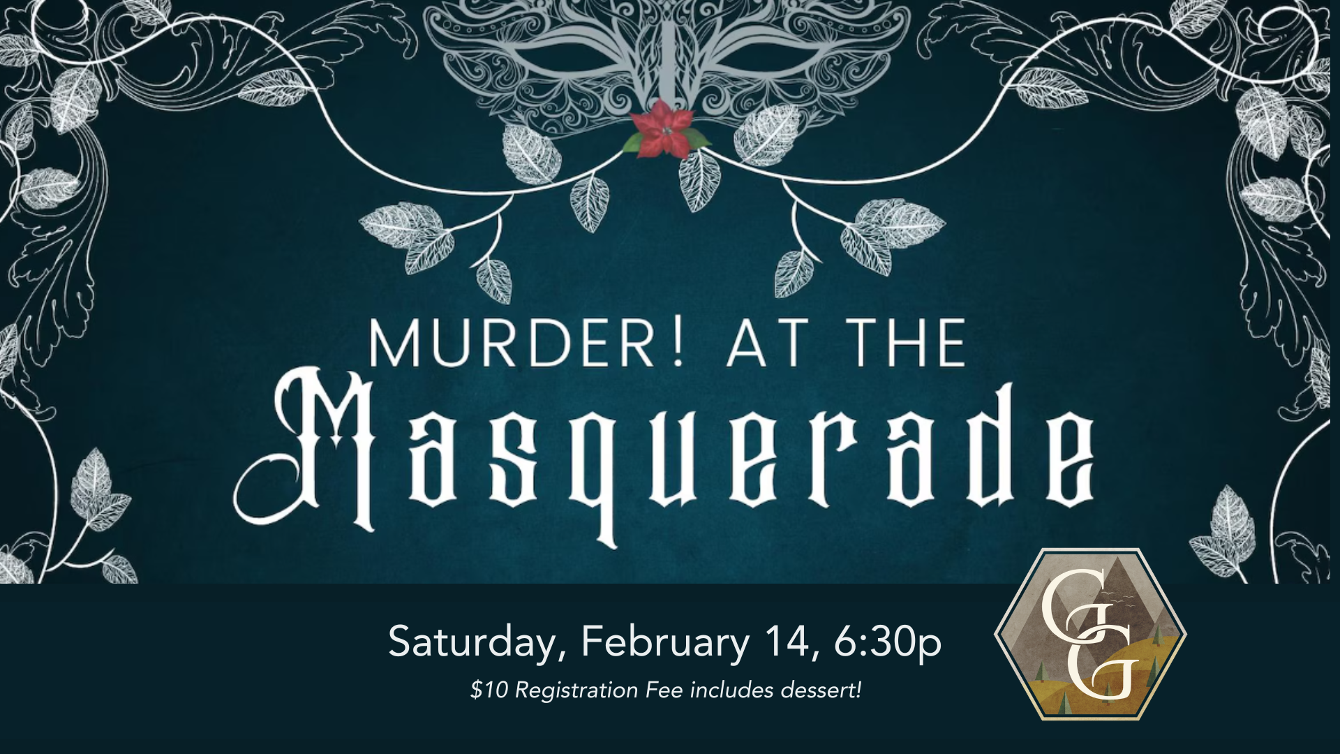 Join us for a murder mystery event! Feel free to dress up (or not!) and play your part to solve the murder (or hide your identity as the murderer)! Characters are assigned beforehand, and you will be sent tips for the event and for costume ideas, if desired. Desserts and punch in keeping with the masquerade theme will be served!
