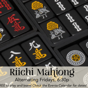 Join us every other Friday at 6:30p for a Shawnee meet-up for Oklahoma Mahjong. Experienced and learning players are all welcome – fun for all ages! We’ll have sets available to teach Japanese Riichi Mahjong – the official Mahjong style of Oklahoma Mahjong. Check out the Oklahoma Mahjong Facebook group for other meet-ups across the state!
