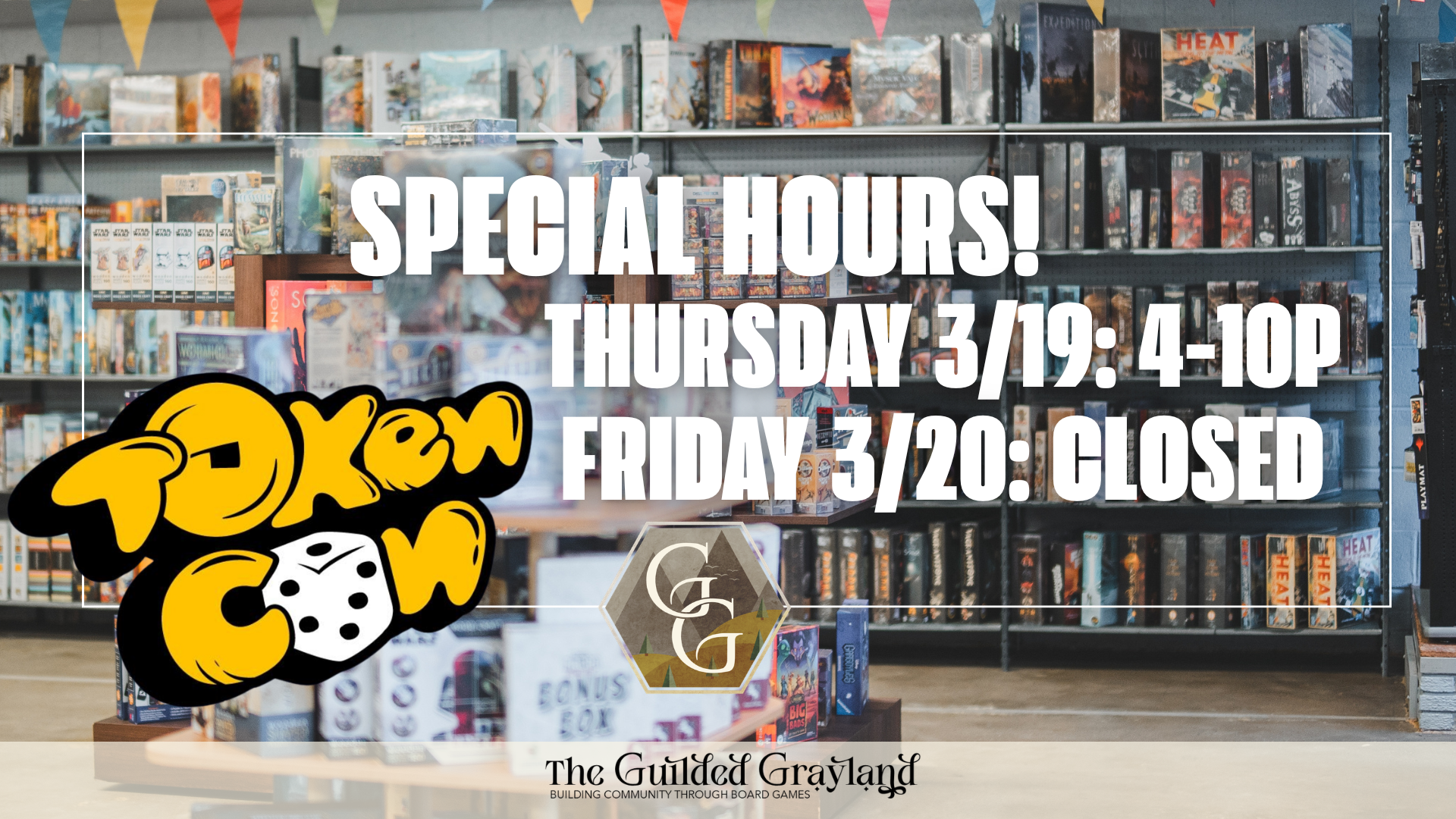 As much of our staff will be attending TokenCon – OKC’s premier Board Game Convention – we will have limited hours! Please make note!