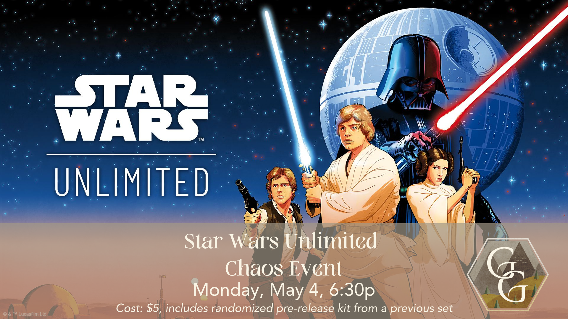 Celebrate May the 4th with a unique Star Wars Unlimited Chaos Event. Spin the wheel to select one of four Prerelease boxes from previous sets and play in a sealed event with the randomly selected box! This event is not only a fun way to celebrate, but a great opportunity to learn the Star Wars Unlimited TCG!