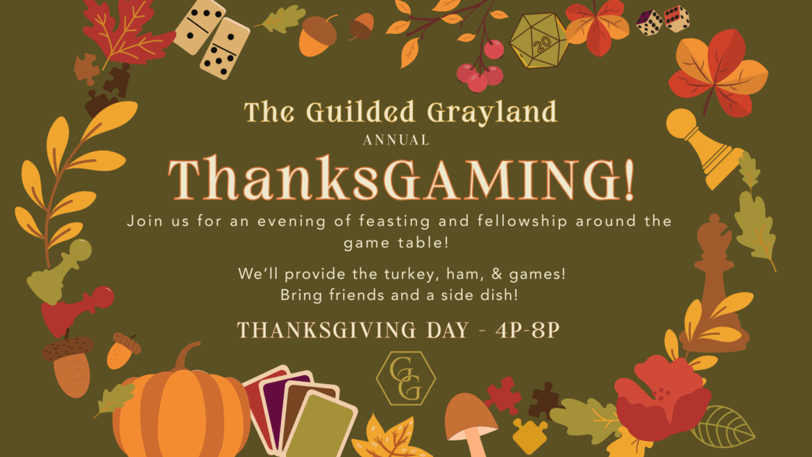 If you’re in need of a place to spend the holiday or just want a good, home-cooked Thanksgiving dinner, we want to invite you to join us at our table on Thanksgiving Day. We’ll provide the turkey and ham and, if you’re able, you can bring a side or dessert to share. Then join us for some good food and good games! Our entire gaming library will be open and free-to-play, so come on your own, or bring the fam – we’d love to have you!